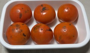 余談ですが、一番おいしい渋柿の食べ方は、木の上で十分熟した柿を食べることです。熟成してシブが抜け、この甘さ比べようがないくらい美味しいです。