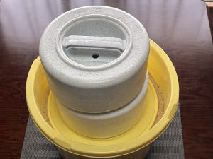 虫などが来ないようにラップして部屋の隅に置きます。おいしく出来上がるのは一年後。もちろん途中途中でつまみ食いしていきます。