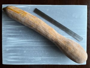 鶴首かぼちゃをお隣の方に頂きました。普段食べているのは西洋かぼちゃ、これは日本固有種のかぼちゃです。とはいっても原産地は南アメリカですが。