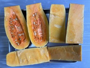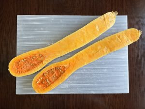 縦に切るとこんな感じ。西洋かぼちゃよりも皮は柔らかいですが、それでもきれいに切るのは難しい。下の膨らんだところに綿と種があります。