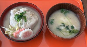 お正月三日はいつものように箱根駅伝を見ながらちびちびやって、八つ頭を頂きます。 おせちの余りで朝からちびちび。 そして八つ頭のお雑煮。 今年もいい八つ頭のお芋が手に入りました。お味噌は、三ヶ月ほど前に私が仕込んだ麦味噌。今年は左にお芋、右にお餅を入れました。