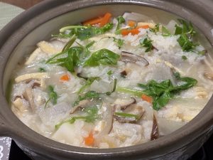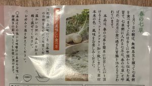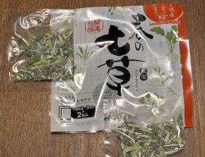 あっという間にお正月三が日が過ぎ今日は七草がゆです。 今年の七草がゆパック。御多分に漏れずこれも値上がりしています。 大きな蕪が入っていました。 他の具材を加えて土鍋で炊きます。 お餅を入れていただきます。 今年初めて気が付きました。七草のフリーズドライなんてのがあるのですね。2パックはいってました。 暖かいお粥にふりかけさっと混ぜ合わせて食べるんだそうです。 台湾に長くいた友人に聞いたら、台湾で食べたことあるよと言ってました。
